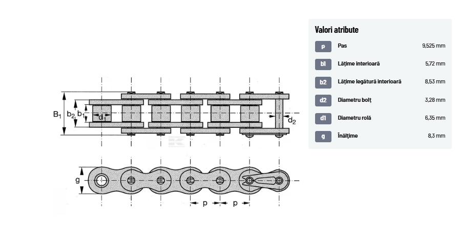 | Descriere detaliată | Lanțuri cu role gopart DIN 8187 simplex | |