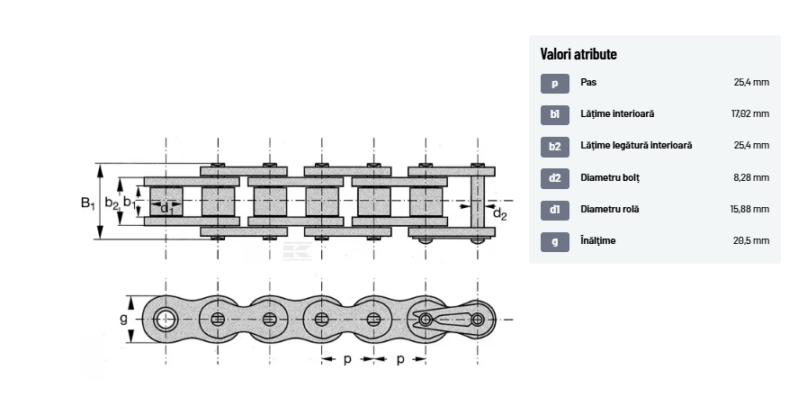 | Descriere detaliată | Lanțuri cu role gopart DIN 8187 simplex | |