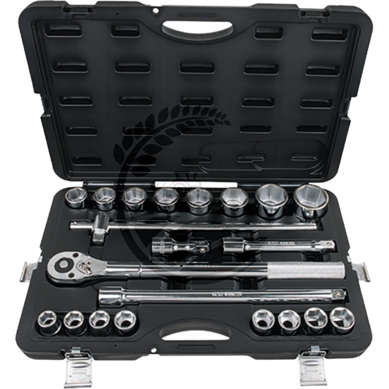 contine: 3/ 4- deschideri chei 24, 4, 26, 27, 29, 30, 32, 35, 36, 38, 41, 46, 50 mm 1 cu cate 1 prelungire fiecare 3/4 ", 100, 200 + 400 mm lungime.1 maner T cu glisant 3/4", lungime 450 mm. 1 clichet reversibil 3/4 ", 24 dinți, lungime de 500 mm, cu levier de comutare