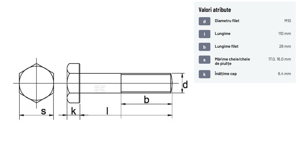 | Descriere detaliată | Șurub cu cap hexagonal, filet parțial, lungimea este măsurată de sub cap. ISO 4014 înlocuiește DIN 931: conform ISO, dimensiune cheilor 16, 18, 21 și 34 sunt acum pentru M10, M12, M14 și, respectiv, M22. | |