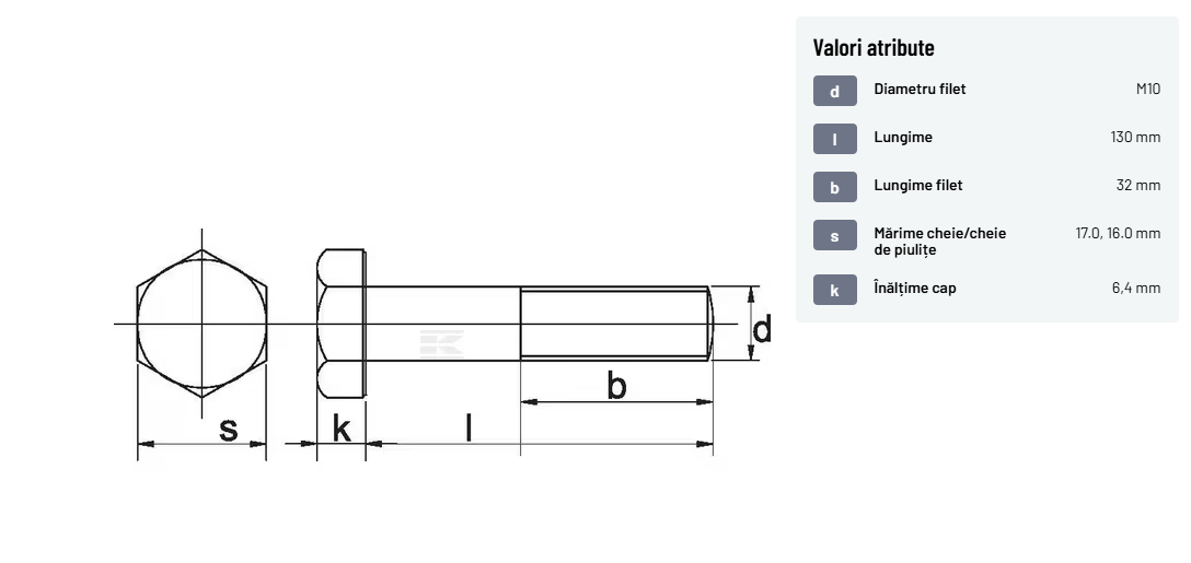 | Descriere detaliată | Șurub cu cap hexagonal, filet parțial, lungimea este măsurată de sub cap. ISO 4014 înlocuiește DIN 931: conform ISO, dimensiune cheilor 16, 18, 21 și 34 sunt acum pentru M10, M12, M14 și, respectiv, M22. | |