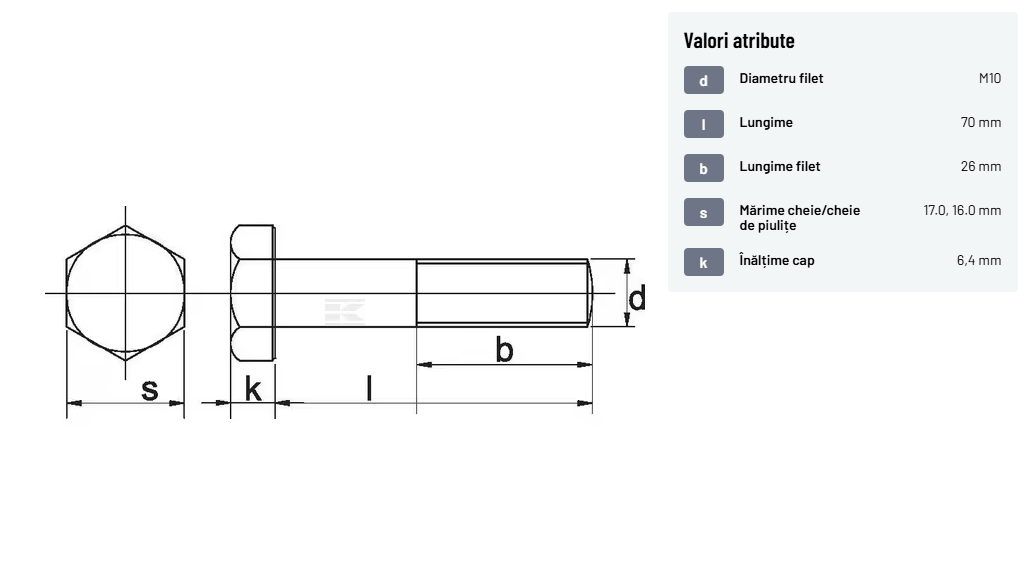 | Descriere detaliată | Șurub cu cap hexagonal, filet parțial, lungimea este măsurată de sub cap. ISO 4014 înlocuiește DIN 931: conform ISO, dimensiune cheilor 16, 18, 21 și 34 sunt acum pentru M10, M12, M14 și, respectiv, M22. | |