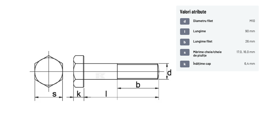 | Descriere detaliată | Șurub cu cap hexagonal, filet parțial, lungimea este măsurată de sub cap. ISO 4014 înlocuiește DIN 931: conform ISO, dimensiune cheilor 16, 18, 21 și 34 sunt acum pentru M10, M12, M14 și, respectiv, M22. | |