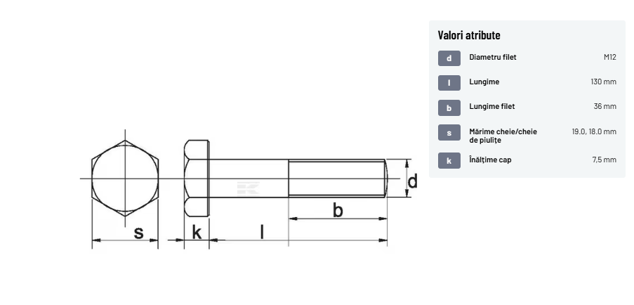 | Descriere detaliată | Șurub cu cap hexagonal, filet parțial, lungimea este măsurată de sub cap. ISO 4014 înlocuiește DIN 931: conform ISO, dimensiune cheilor 16, 18, 21 și 34 sunt acum pentru M10, M12, M14 și, respectiv, M22. | |