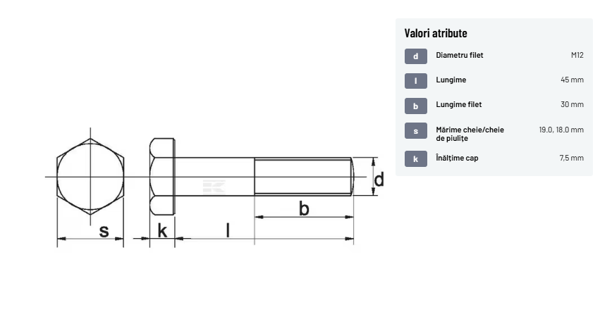 | Descriere detaliată | Șurub cu cap hexagonal, filet parțial, lungimea este măsurată de sub cap. ISO 4014 înlocuiește DIN 931: conform ISO, dimensiune cheilor 16, 18, 21 și 34 sunt acum pentru M10, M12, M14 și, respectiv, M22. | |