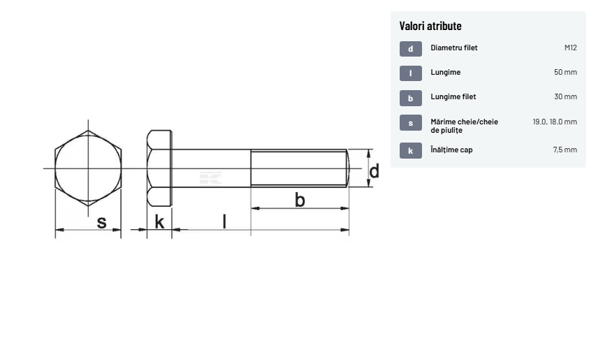 | Descriere detaliată | Șurub cu cap hexagonal, filet parțial, lungimea este măsurată de sub cap. ISO 4014 înlocuiește DIN 931: conform ISO, dimensiune cheilor 16, 18, 21 și 34 sunt acum pentru M10, M12, M14 și, respectiv, M22. | |