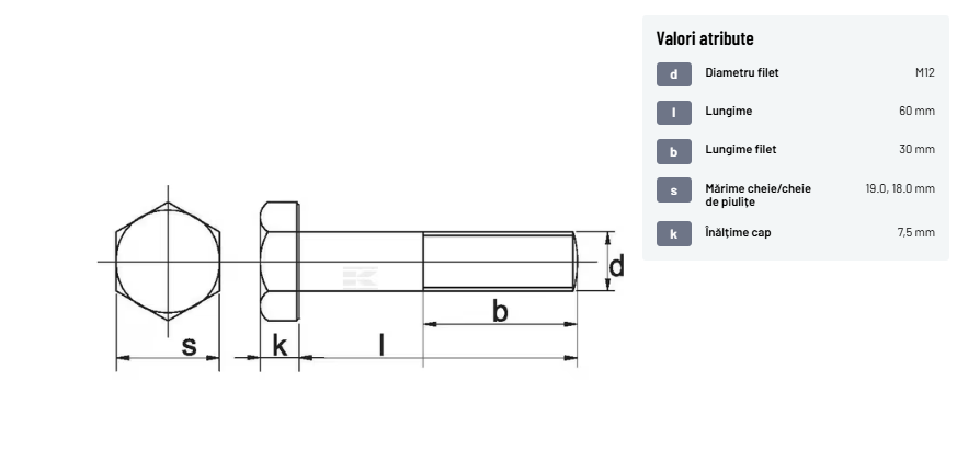 | Descriere detaliată | Șurub cu cap hexagonal, filet parțial, lungimea este măsurată de sub cap. ISO 4014 înlocuiește DIN 931: conform ISO, dimensiune cheilor 16, 18, 21 și 34 sunt acum pentru M10, M12, M14 și, respectiv, M22. | |