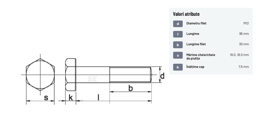 | Descriere detaliată | Șurub cu cap hexagonal, filet parțial, lungimea este măsurată de sub cap. ISO 4014 înlocuiește DIN 931: conform ISO, dimensiune cheilor 16, 18, 21 și 34 sunt acum pentru M10, M12, M14 și, respectiv, M22. | |