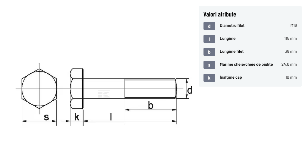 | Descriere detaliată | Șurub cu cap hexagonal, filet parțial, lungimea este măsurată de sub cap. ISO 4014 înlocuiește DIN 931: conform ISO, dimensiune cheilor 16, 18, 21 și 34 sunt acum pentru M10, M12, M14 și, respectiv, M22. | |