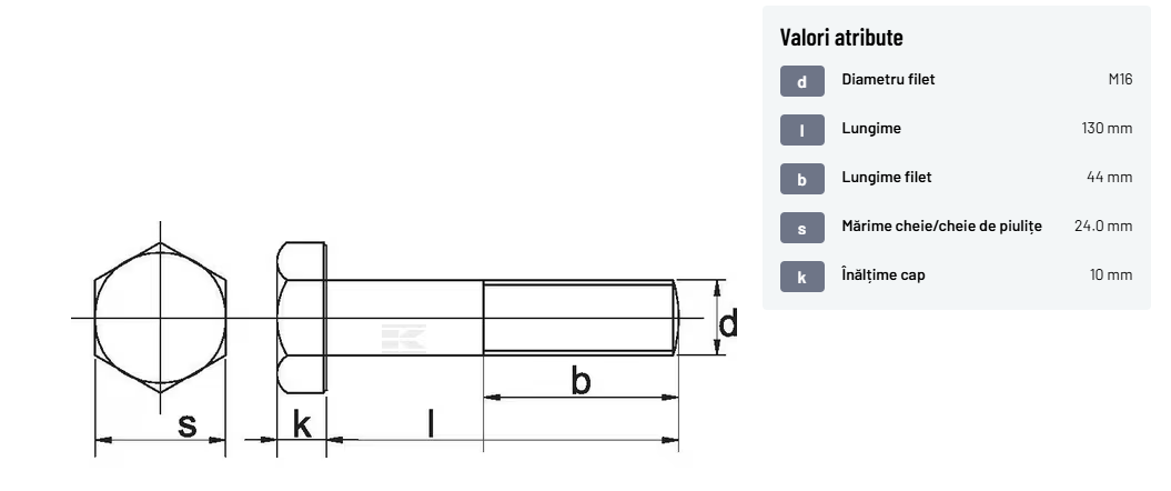 | Descriere detaliată | Șurub cu cap hexagonal, filet parțial, lungimea este măsurată de sub cap. ISO 4014 înlocuiește DIN 931: conform ISO, dimensiune cheilor 16, 18, 21 și 34 sunt acum pentru M10, M12, M14 și, respectiv, M22. | |