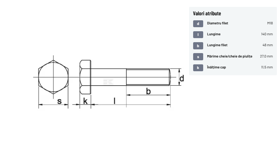 | Descriere detaliată | Șurub cu cap hexagonal, filet parțial, lungimea este măsurată de sub cap. ISO 4014 înlocuiește DIN 931: conform ISO, dimensiune cheilor 16, 18, 21 și 34 sunt acum pentru M10, M12, M14 și, respectiv, M22. | |