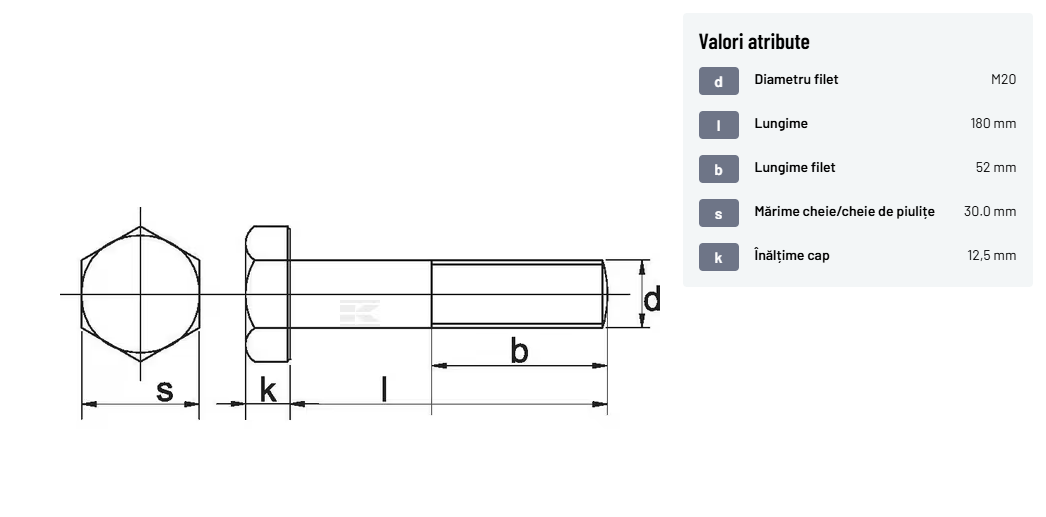 | Descriere detaliată | Șurub cu cap hexagonal, filet parțial, lungimea este măsurată de sub cap. ISO 4014 înlocuiește DIN 931: conform ISO, dimensiune cheilor 16, 18, 21 și 34 sunt acum pentru M10, M12, M14 și, respectiv, M22. | |