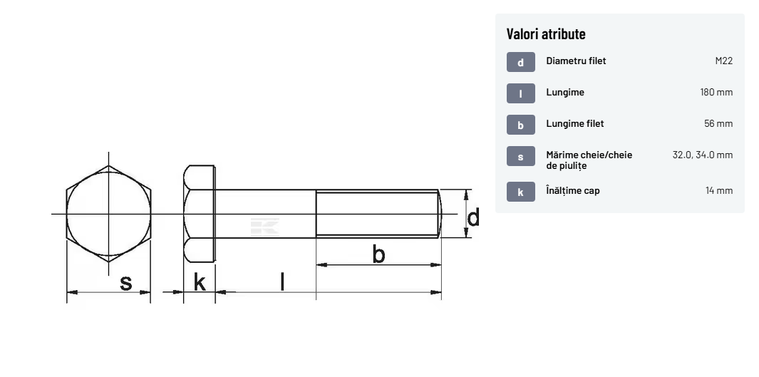 | Descriere detaliată | Șurub cu cap hexagonal, filet parțial, lungimea este măsurată de sub cap. ISO 4014 înlocuiește DIN 931: conform ISO, dimensiune cheilor 16, 18, 21 și 34 sunt acum pentru M10, M12, M14 și, respectiv, M22. | |