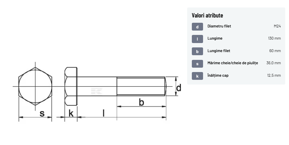 | Descriere detaliată | Șurub cu cap hexagonal, filet parțial, lungimea este măsurată de sub cap. ISO 4014 înlocuiește DIN 931: conform ISO, dimensiune cheilor 16, 18, 21 și 34 sunt acum pentru M10, M12, M14 și, respectiv, M22. | |