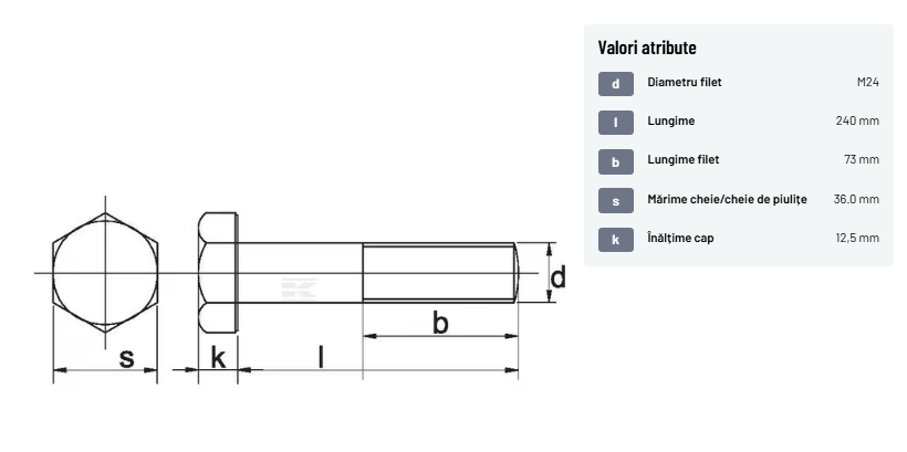 | Descriere detaliată | Șurub cu cap hexagonal, filet parțial, lungimea este măsurată de sub cap. ISO 4014 înlocuiește DIN 931: conform ISO, dimensiune cheilor 16, 18, 21 și 34 sunt acum pentru M10, M12, M14 și, respectiv, M22. | |