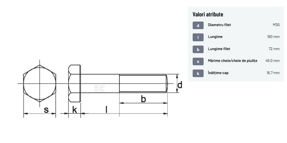 | Descriere detaliată | Șurub cu cap hexagonal, filet parțial, lungimea este măsurată de sub cap. ISO 4014 înlocuiește DIN 931: conform ISO, dimensiune cheilor 16, 18, 21 și 34 sunt acum pentru M10, M12, M14 și, respectiv, M22. | |