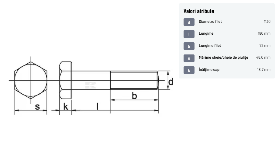 | Descriere detaliată | Șurub cu cap hexagonal, filet parțial, lungimea este măsurată de sub cap. ISO 4014 înlocuiește DIN 931: conform ISO, dimensiune cheilor 16, 18, 21 și 34 sunt acum pentru M10, M12, M14 și, respectiv, M22. | |