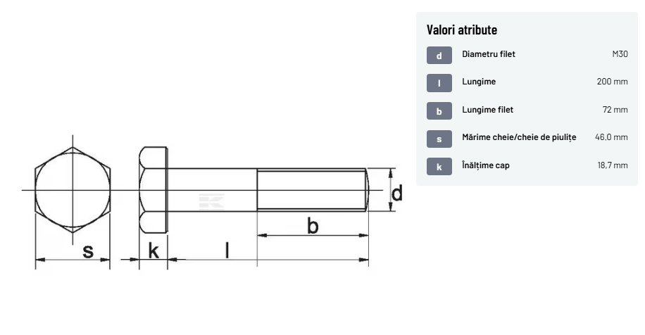 | Descriere detaliată | Șurub cu cap hexagonal, filet parțial, lungimea este măsurată de sub cap. ISO 4014 înlocuiește DIN 931: conform ISO, dimensiune cheilor 16, 18, 21 și 34 sunt acum pentru M10, M12, M14 și, respectiv, M22. | |
