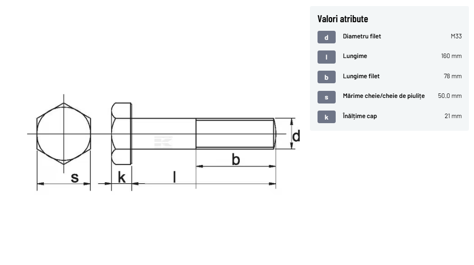 | Descriere detaliată | Șurub cu cap hexagonal, filet parțial, lungimea este măsurată de sub cap. ISO 4014 înlocuiește DIN 931: conform ISO, dimensiune cheilor 16, 18, 21 și 34 sunt acum pentru M10, M12, M14 și, respectiv, M22. | |