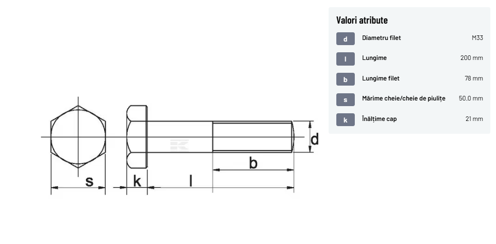 | Descriere detaliată | Șurub cu cap hexagonal, filet parțial, lungimea este măsurată de sub cap. ISO 4014 înlocuiește DIN 931: conform ISO, dimensiune cheilor 16, 18, 21 și 34 sunt acum pentru M10, M12, M14 și, respectiv, M22. | |