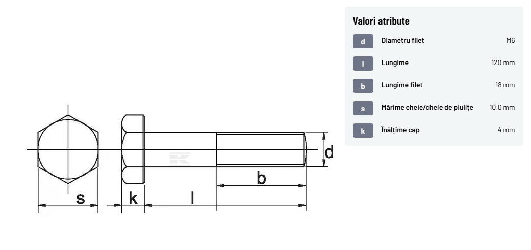 | Descriere detaliată | Șurub cu cap hexagonal, filet parțial, lungimea este măsurată de sub cap. ISO 4014 înlocuiește DIN 931: conform ISO, dimensiune cheilor 16, 18, 21 și 34 sunt acum pentru M10, M12, M14 și, respectiv, M22. | |