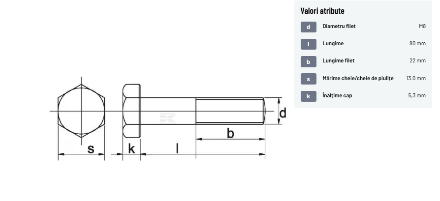 | Descriere detaliată | Șurub cu cap hexagonal, filet parțial, lungimea este măsurată de sub cap. ISO 4014 înlocuiește DIN 931: conform ISO, dimensiune cheilor 16, 18, 21 și 34 sunt acum pentru M10, M12, M14 și, respectiv, M22. | |